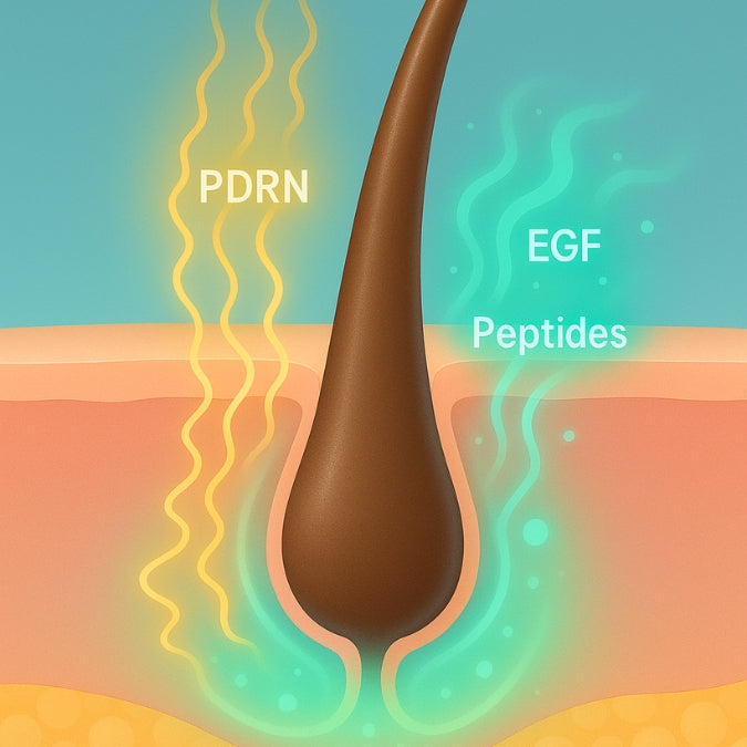Our PHYTO PDRN® is derived from Korean wild ginseng root, offering a vegan alternative to traditional salmon DNA-based PDRN. PDRN works by providing cellular regeneration signals that help awaken dormant hair follicles and promote tissue repair. Combined with growth factors like EGF, FGF, and copper tripeptide-1, this creates a comprehensive regenerative environment for your scalp. Unlike simple vitamins or caffeine alone, PDRN addresses hair loss at the cellular level, which is why users often see more dramatic improvements in density and reduced shedding.